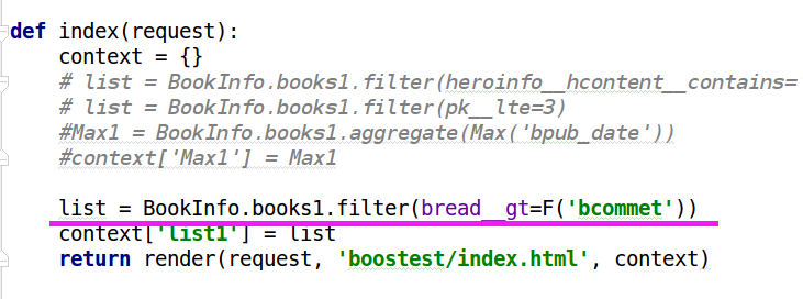 - 可以使用模型的字段A与字段B进行比较,如果A写在了等号的左边,则B出现在等号的右边,需要通过F对象构造
