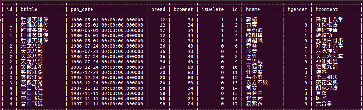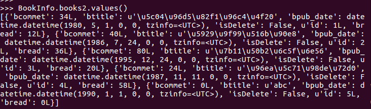 [{'bcommet': 34L, 'btitle': u'\u5c04\u96d5\u82f1\u96c4\u4f20', 'bpub_date': datetime.datetime(1980, 5, 1, 0, 0, tzinfo=<UTC>), 'isDelete': False, u'id': 1L, 'bread': 12L}, {'bcommet': 40L, 'btitle': u'\u5929\u9f99\u516b\u90e8', 'bpub_date': datetime.datetime(1986, 7, 24, 0, 0, tzinfo=<UTC>), 'isDelete': False, u'id': 2L, 'bread': 36L}, {'bcommet': 80L, 'btitle': u'\u7b11\u50b2\u6c5f\u6e56', 'bpub_date': datetime.datetime(1995, 12, 24, 0, 0, tzinfo=<UTC>), 'isDelete': False, u'id': 3L, 'bread': 20L}, {'bcommet': 24L, 'btitle': u'\u96ea\u5c71\u98de\u72d0', 'bpub_date': datetime.datetime(1987, 11, 11, 0, 0, tzinfo=<UTC>), 'isDelete': False, u'id': 4L, 'bread': 58L}, {'bcommet': 0L, 'btitle': u'abc', 'bpub_date': datetime.datetime(1990, 1, 1, 0, 0, tzinfo=<UTC>), 'isDelete': False, u'id': 5L, 'bread': 0L}]