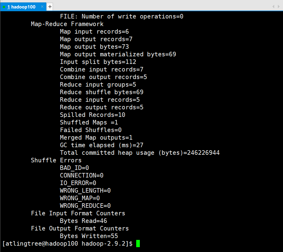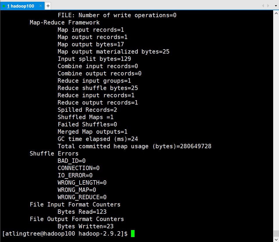 [atlingtree@hadoop100 hadoop-2.9.2]$ bin/hadoop jar share/hadoop/mapreduce/hadoop-mapreduce-examples-2.9.2.jar grep input output 'dfs[a-z.]+'