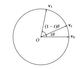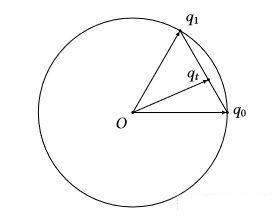 师兄:四元数的线性插值是非常简单,但是是有代价的。如下图所示,四元数表示旋转时是单位四元数,这种插值方式,相当于我们是沿着一条直线(也就是圆上的一个弦)进行插值的,这样插值出来的四元数不是单位四元数,而且还有其他问题(后面会说)。