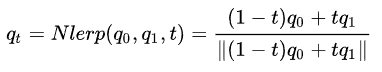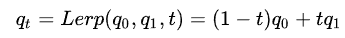 假设有两个四元数 q0,q1,想要在位置 t 处求插值 qt,用线性插值可以这样计算,是不是很熟悉?
