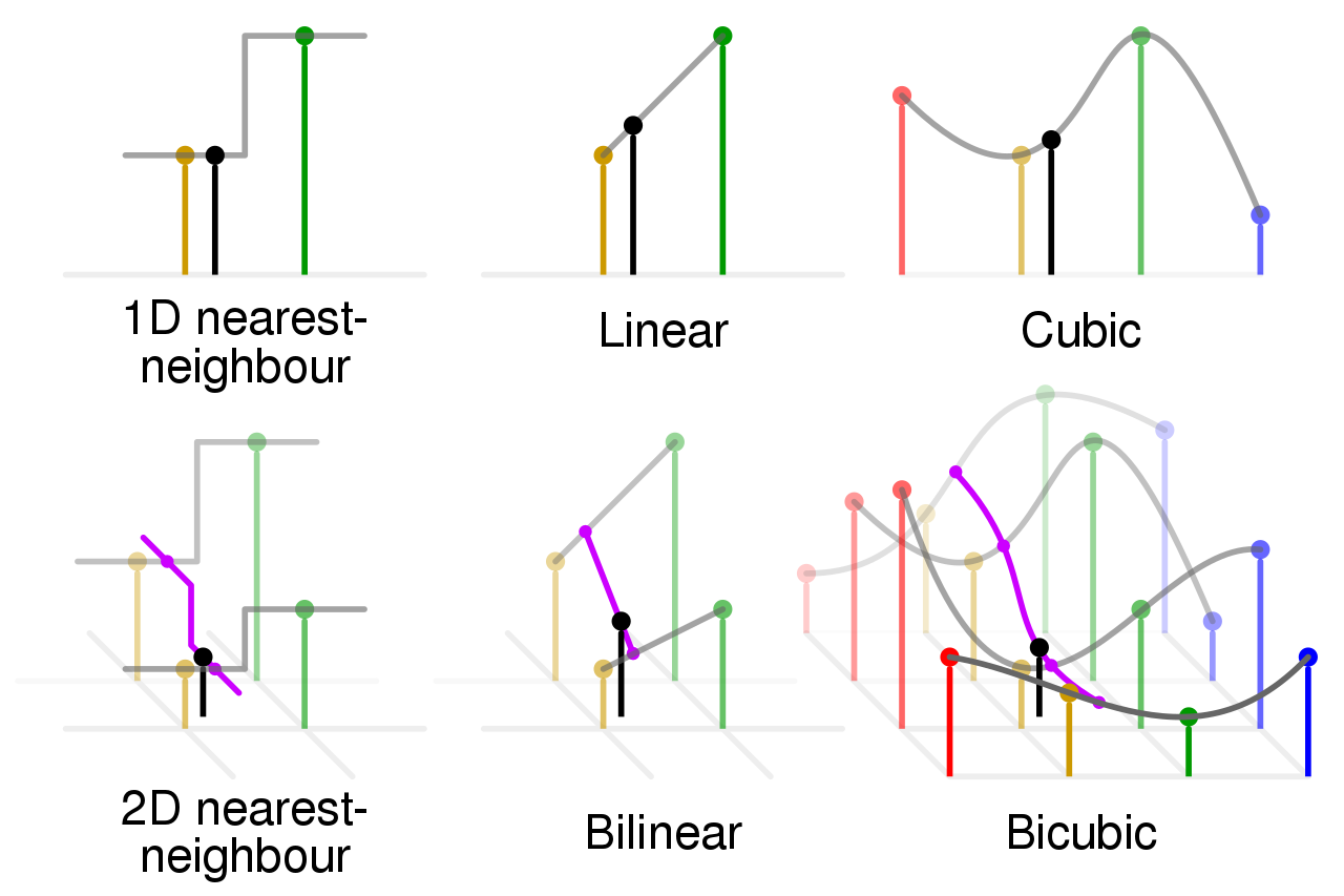 师兄:嗯,以后多举例子。插值方法有很多种,比如最简单的最邻近插值(nearest interpolation)、线性插值(linear interpolation);常用的双线性插值(Bilinear interpolation),还有保护图像细节效果较好的双三次插值(bicubic interpolation)、三次样条插值(cubic Spline Interpolation)等。