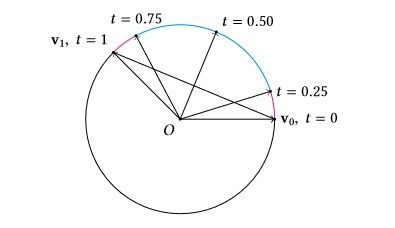师兄:且慢!还是有其他问题的。如下图所示,在同等时间内, vt 扫过的⻆度是不同的, vt 扫过的速度(或者说⻆速度)首先会不断地增加,到t = 0.50之后会开始减速,所以Nlerp插值不能保证均匀的⻆速度。