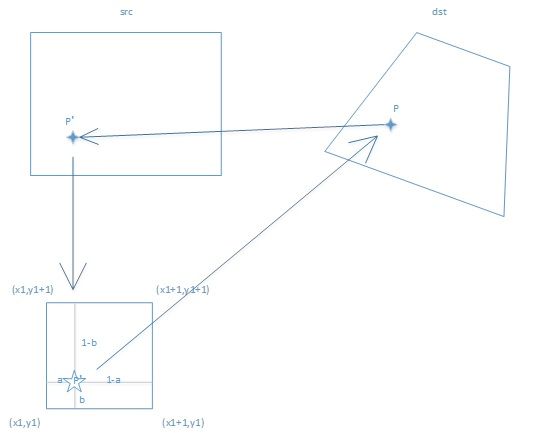 当我们要对图像进行插值操作的时候,通常需要遍历dst中的每一个像素点,假设dst中某像素点为p(x0,y0),对像素点p进行相应变换,使其对应到原图src中的p’(x0’,y0’)点。在我们遍历dst像素的时候, p点的像素值(x0,y0)都是整数,然而变换后对应到原图src中的p’点的像素值(x0’,y0’)就不一定是整数了。