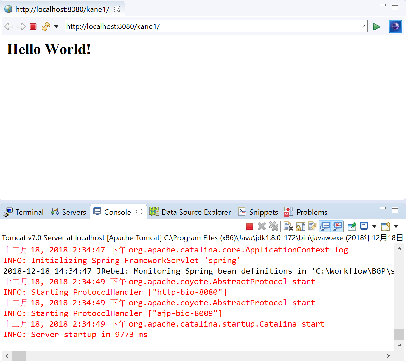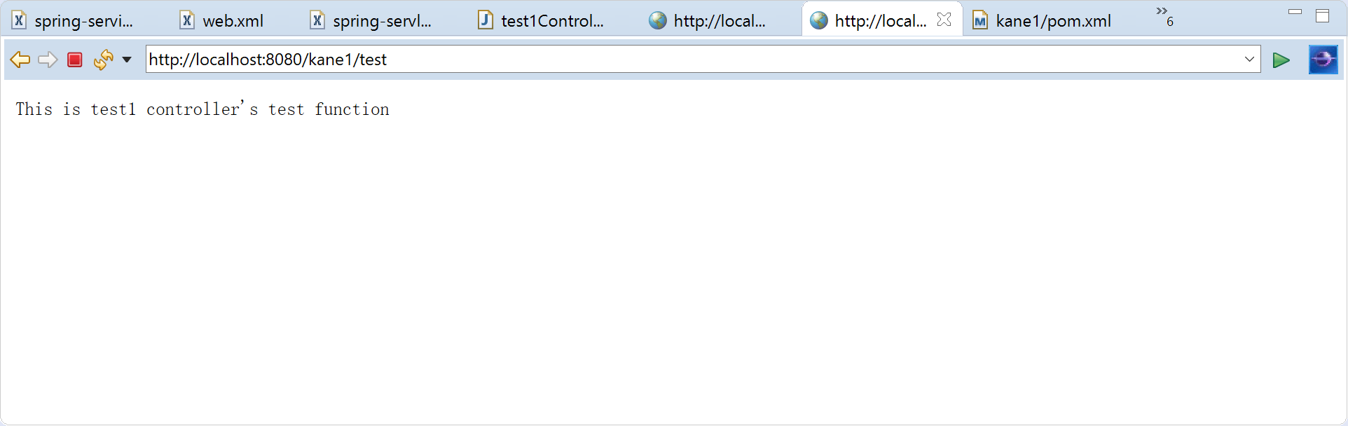 重新启动服务器,在url中输入 http://localhost:8080/kane1/test,上图: