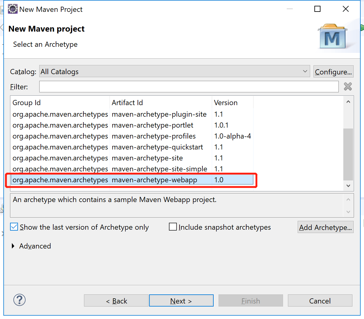 - 如下图,请选择 maven-archetype-webapp,因为我们要创建一个web项目