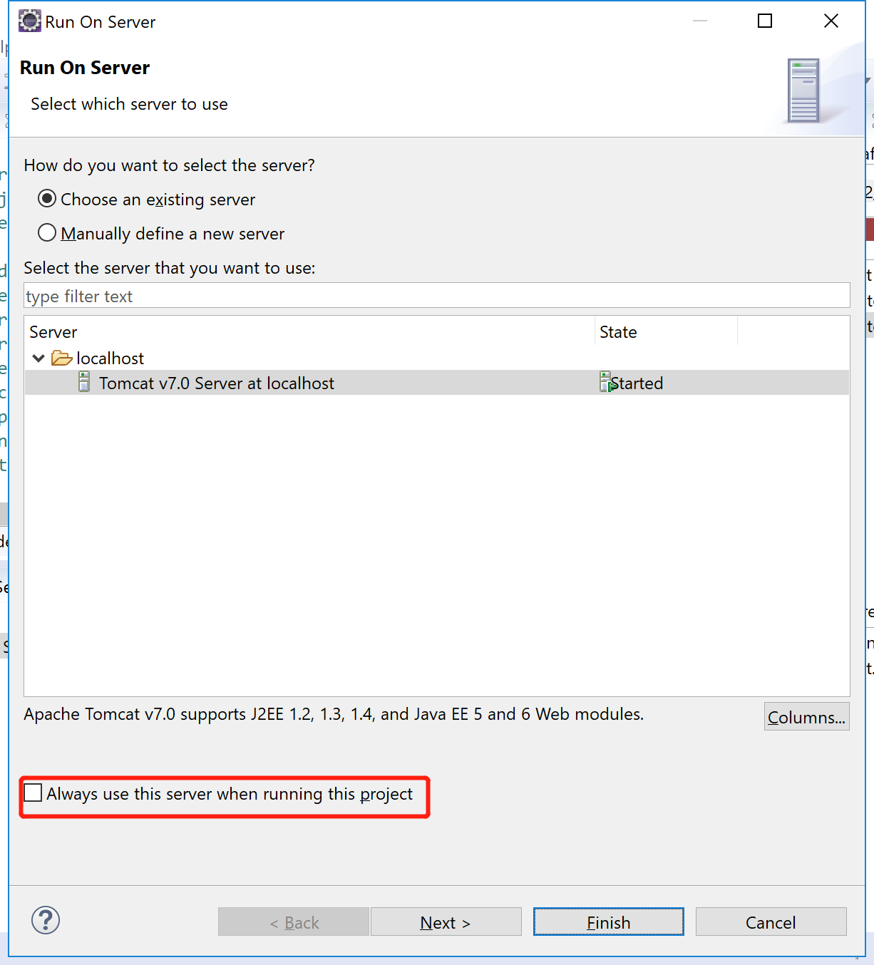 项目上右键依次 Run As-> Run on Server,选择刚才添加的Tomcat,