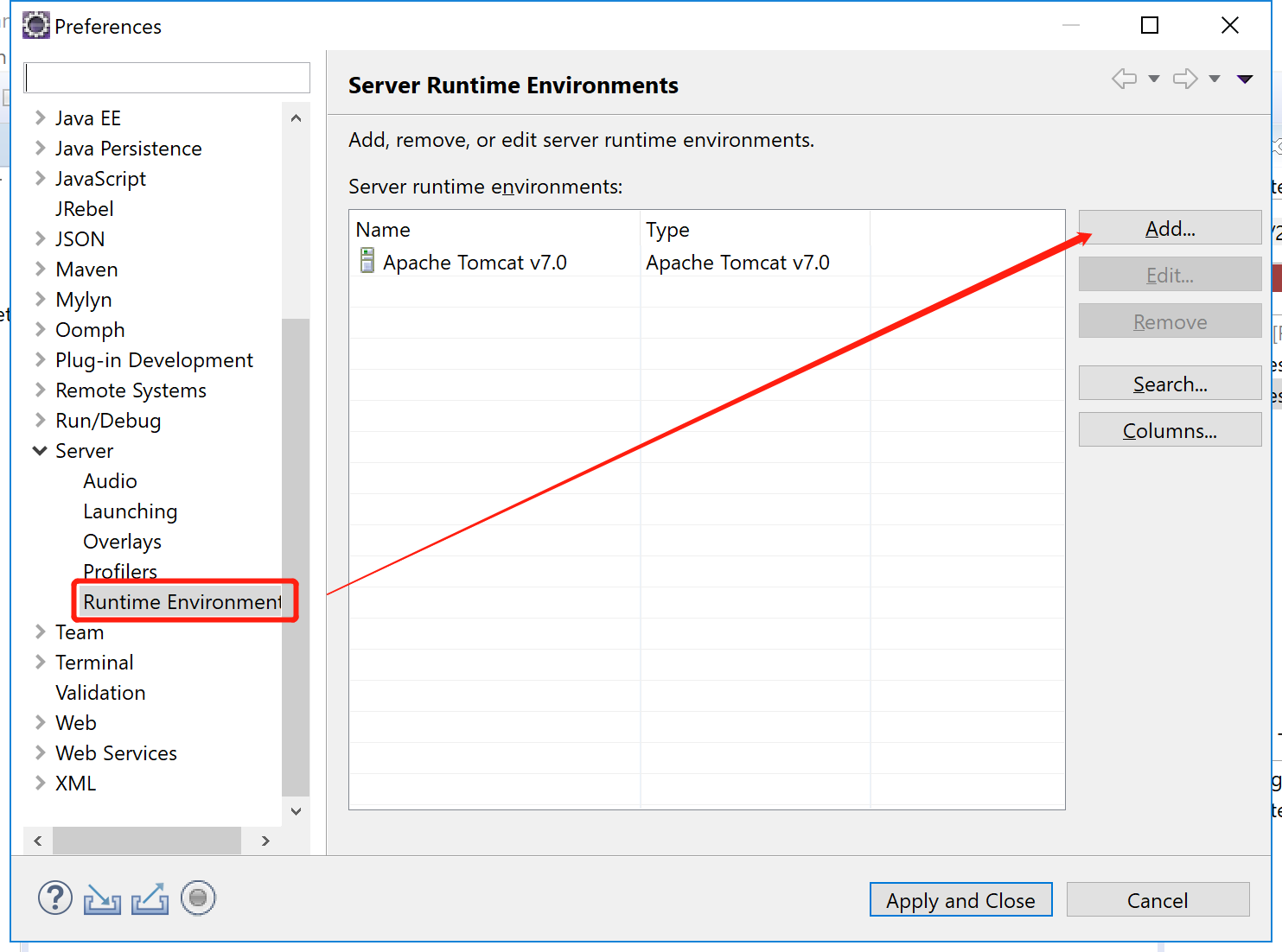 如图一次找到 Server->Runtime Environments 点击子面板上的 Add 按钮