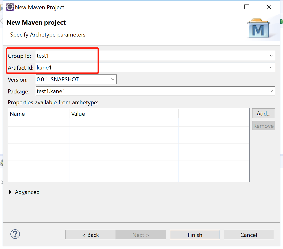 - 如下图输入 group id 与 artifact id 点击finish即可