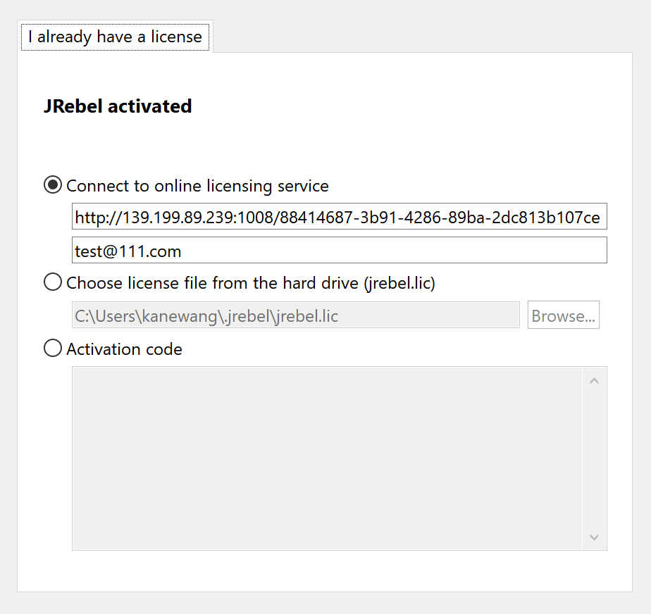 依次打开 Help->JRebel->Configuration配置lincense,免费的话选择第三个Activation Code,将刚才注册账号时给的code复制进来就可以。在这里推荐一个永久免费的,是我在网上找到的一个server:http://139.199.89.239:1008/,邮箱随便输入就好了。