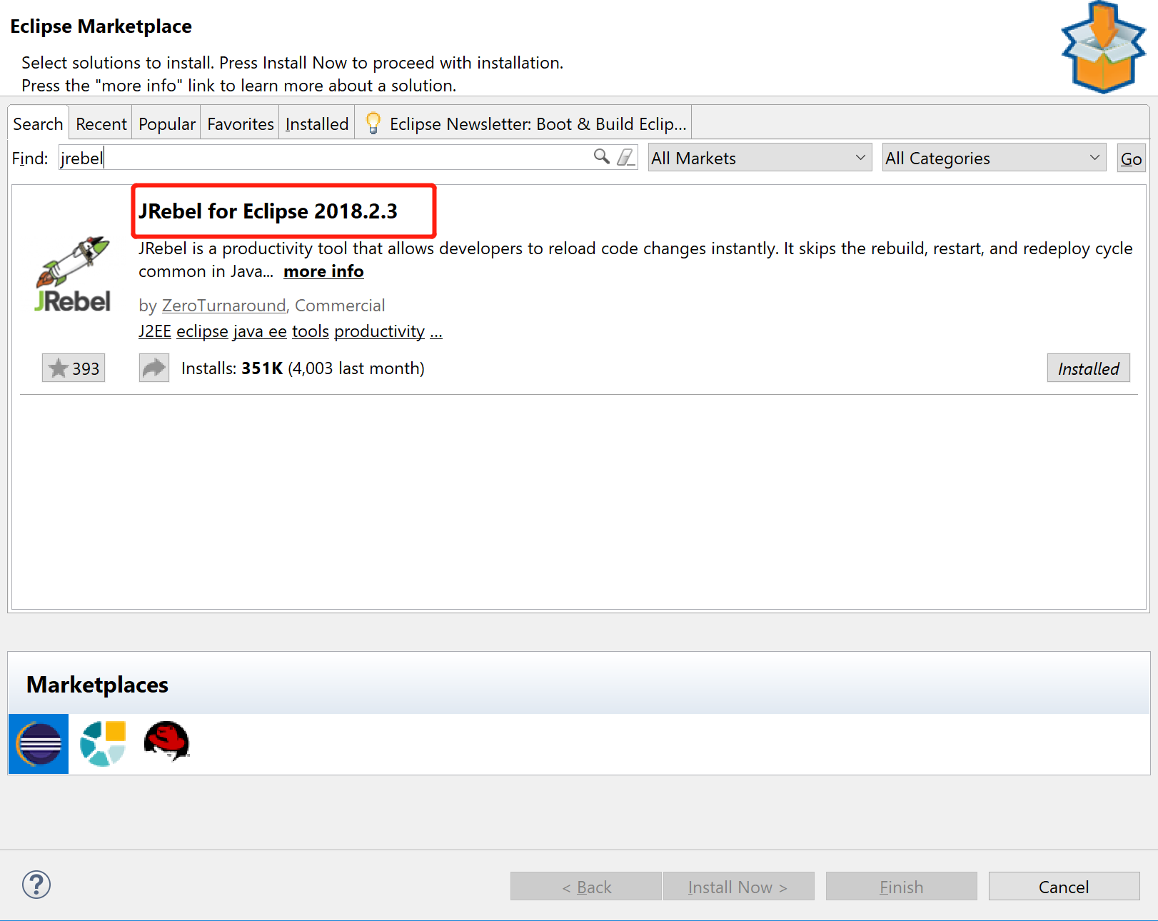 依次点击 Help -> Eclipse Marketplace搜索 Jrebel 插件,依次安装上,重启Eclipse。