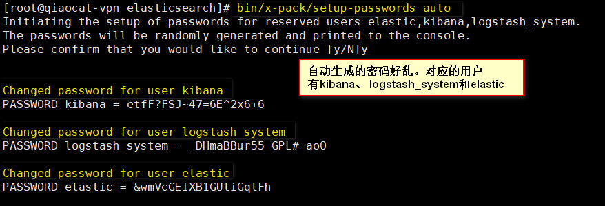 所以第三步则是生成默认的密码,这个密码用于elastic和kibana用户: