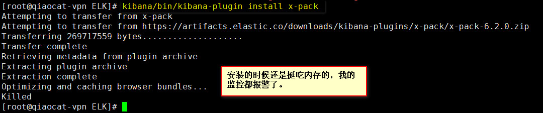 注意的是,kibana安装x-pack会有那么一小段时间很短暂的时间很吃内存,我监控都报警了。
