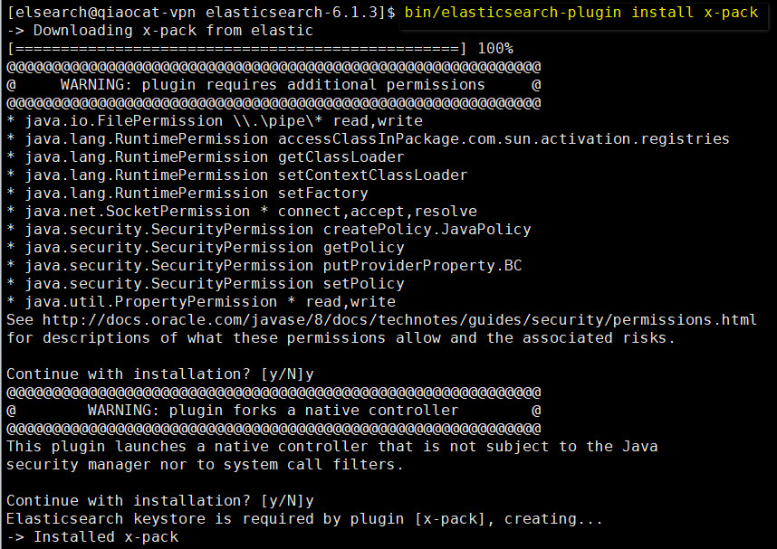 参照上图官方所提及的x-pack安装步骤,我们先来进行第一步,从elasticsearch开始安装x-pack插件: bin/elasticsearch-plugin install x-pack