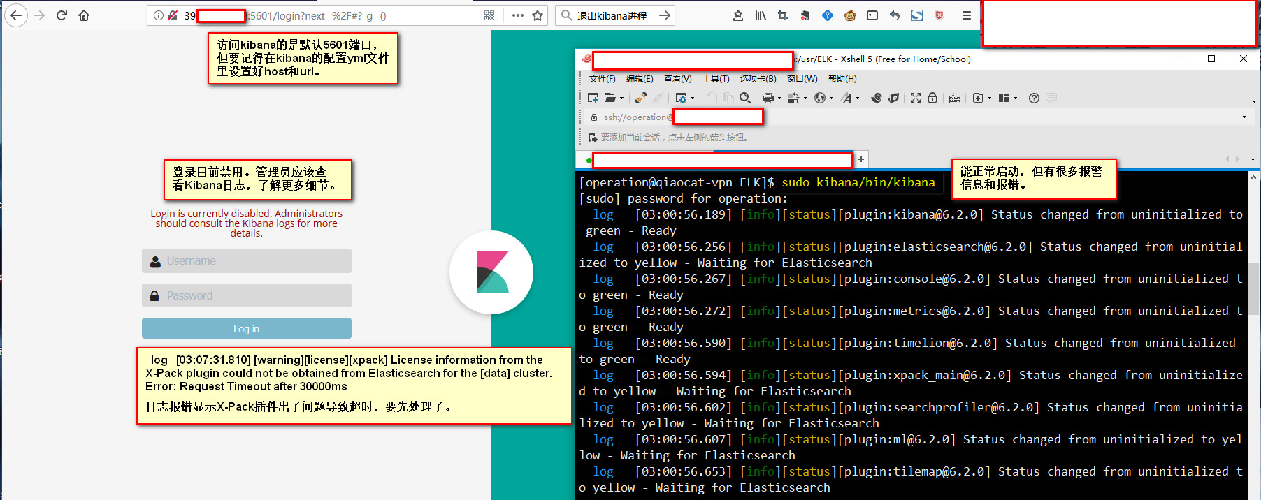 第六步,启动kibana服务,同时防火墙,安全组之类开放服务默认的5601端口; nohup bin/kibana & 或直接sudo /bin/kibana启动。 访问kibana的是默认5601端口,但要记得在kibana的配置yml文件里设置好host和url。 能正常启动,但有很多报警信息和报错。浏览器访问kibana界面时也可以看到出现登录被禁用的错误了: