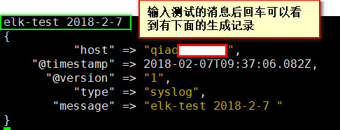 我随意输入的是elk-test 2018-2-7,回车后就生成了一段日志记录。 Logstash在Console返回的输出内容,同时以上内容也发送到了ElasticSearch。
