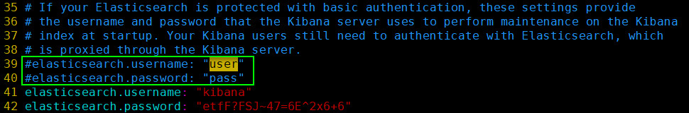 添加上 elasticsearch.username: "kibana" elasticsearch.password: "etfF?FSJ~47=6E^2x6+6" 用户名为kibana,密码则可以先填之前第三步生成的随机密码。 后补注:以上填写的信息是错误的,正确的是填elsatic的用户名和密码才不会出现接下来的错误!
