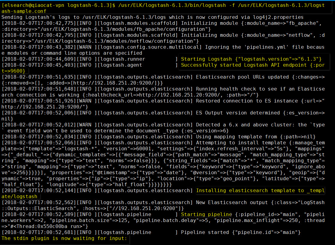 切换到elsearch用户,在logstash主目录下,运行: /usr/ELK/logstash-6.1.3/bin/logstash -f /usr/ELK/logstash-6.1.3/logstash-sample.conf