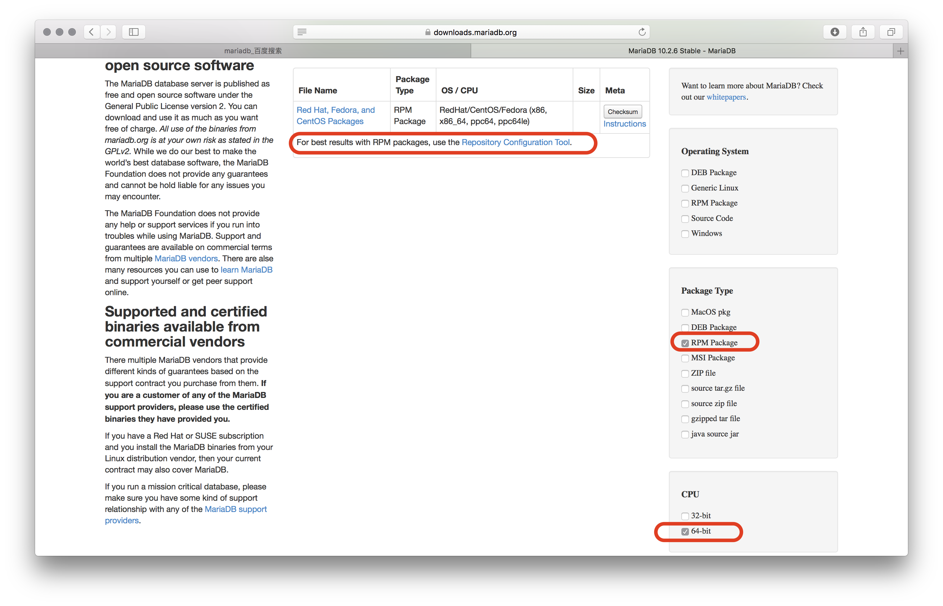 右边可以选择 需要安装的平台、需要的安装包格式、CPU 位数。这里选择 RPM Package ,下面CPU部分选择 64-bit ,然后就可以看到这样的页面:
