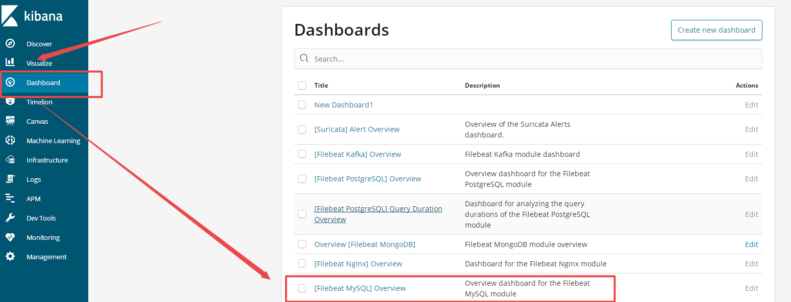 7、接下来就是到kibana界面,在这里,你不需要事先创建索引等等操作,直接点击dashboard界面选择mysql即可,比如: