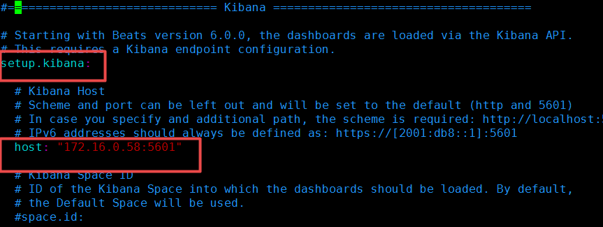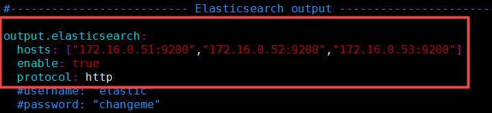 2、在配置文件/etc/filebeat/filebeat.yml启用输出到elasticsearch和kibana的功能。