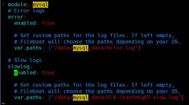 4、在配置文件/etc/filebeat/modules.d/mysql.yml进行设置。