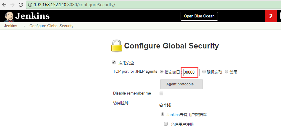 - 在系统管理中的Configure Global Security中开启TCP port for JNLP agents,随机选取或指定端口