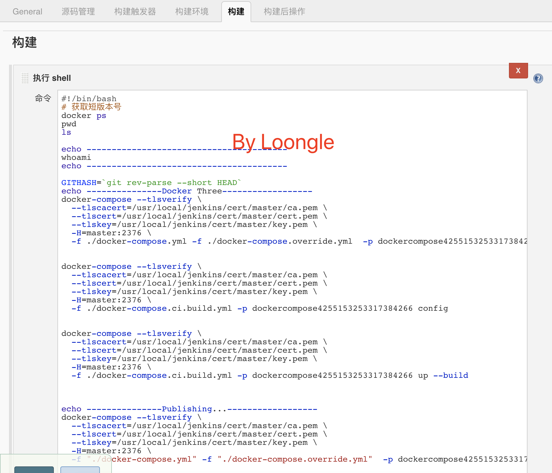 请各位读者在填写执行Shell内容时注意 -H=master:2376 ,master的含义是生成证书使用的域名,亦是在上篇博文中,启动 Jenkins 添加 --add-host 解析参数,笔者填写的解析IP:192.168.6.200,所以最后笔者访问master将会指向6.200的机器。当然,读者若使用的是云服务器,并且配置了域名解析,那么只需要将 master 改成解析的域名即可,不需要在启动 Jenkins 添加 --add-host 参数。请各位读者谨记,避免踩坑。为了方便各位读者,重贴启动 Jenkins 代码,请按需修改启动参数。