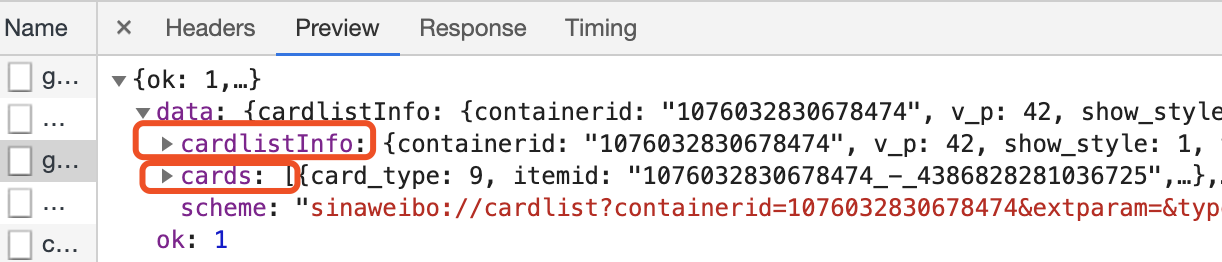 可以看到,最关键 的两部分信息就是 cardlistlnfo 和 cards:前者包含一个 比较重要的信息 total,观察后可以发现, 它其实是微博的总数量,我们可以根据这个数字来估算分页数;后者则是一个列表,它包含 10 个元 素 ,展开其中 一个看一下,