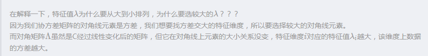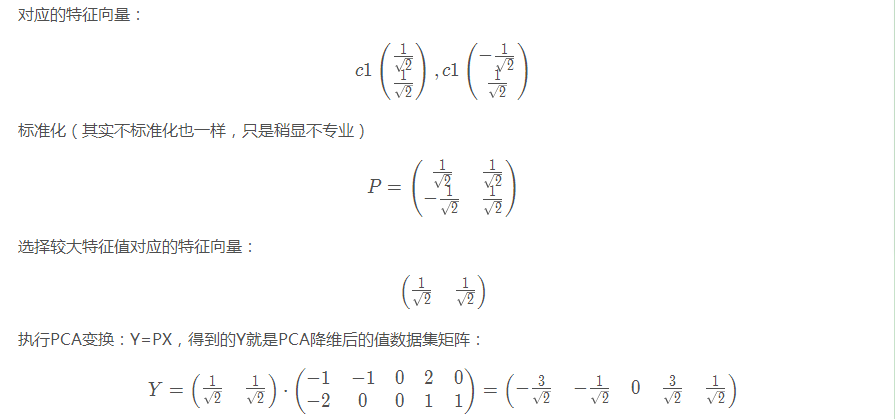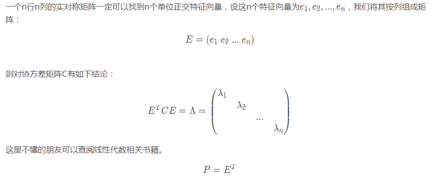 P是协方差矩阵的特征向量单位化后按行排列出的矩阵,其中每一行都是C的一个特征向量。如果设P按照中特征值的从大到小,将特征向量从上到下排列,则用P的前K行组成的矩阵乘以原始数据矩阵X,就得到了我们需要的降维后的数据矩阵Y。