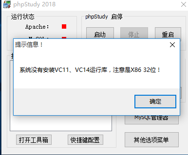 安装成功,但是在启动时提示:【系统没有安装VC11、VC14运行库,注意时X86 32位!】