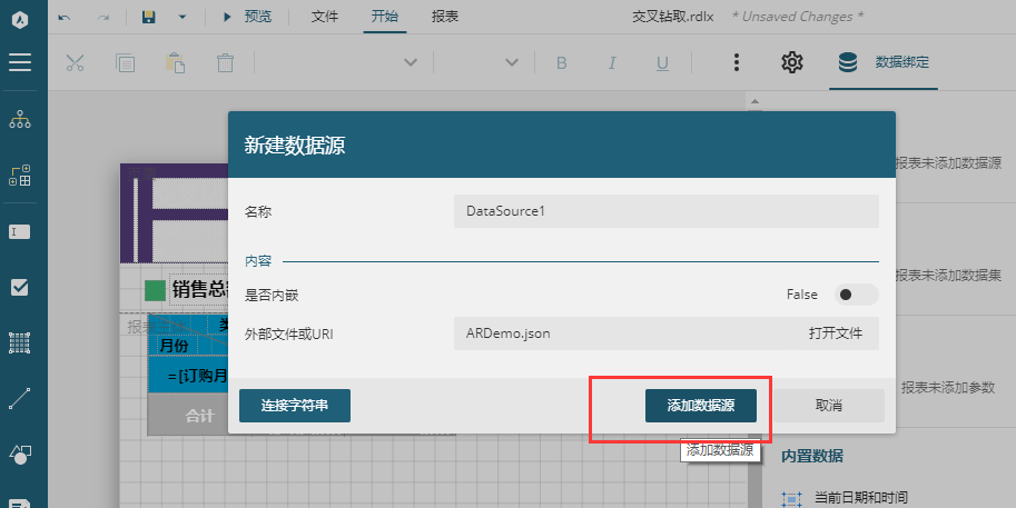 这样数据成功之后,使用 ActiveReports JS Electron Designer 可以直接打开 ActiveReports Net 的rdlx 报表格式,打开后修改数据源为Json