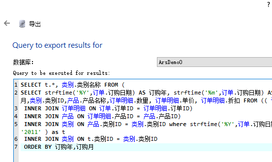 "query": "SELECT t.*, 类别.类别名称 FROM (\nSELECT strftime('%Y',订单.订购日期) AS 订购年, strftime('%m',订单.订购日期) AS 订购月,类别.类别ID,产品.产品名称,订单明细.数量, 订单明细.单价, 订单明细.折扣 FROM (( 订单 \n INNER JOIN 订单明细 ON 订单.订单ID = 订单明细.订单ID)\n INNER JOIN 产品 ON 订单明细.产品ID = 产品.产品ID)\n INNER JOIN 类别 ON 产品.类别ID = 类别.类别ID where strftime('%Y',订单.订购日期) = '2011' ) as t\n INNER JOIN 类别 ON t.类别ID = 类别.类别ID\n ORDER BY 订购年,订购月",