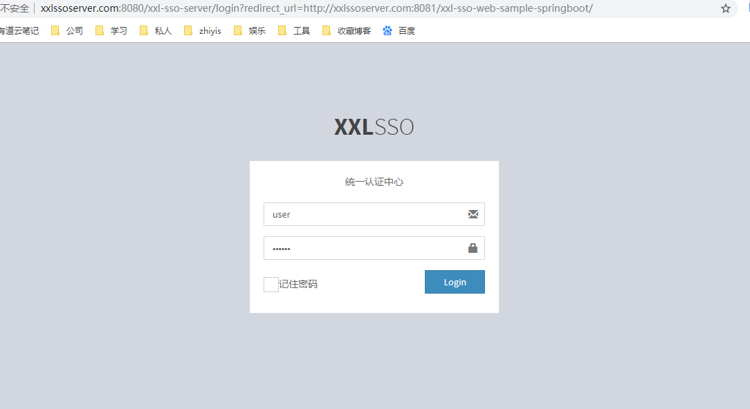 启动两个客户端8081端口和8082端口,登录客户端 http://xxlssoserver.com:8081/xxl-sso-web-sample-springboot会自动跳转到http://xxlssoserver.com:8080/xxl-sso-server/login?redirect_url=http://xxlssoserver.com:8081/xxl-sso-web-sample-springboot/