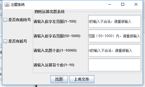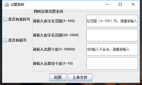 1、判断输入的出题数、运算符个数、范围等是否合法或者超出其范围(展示了对数的范围的处理,代码结果如下)