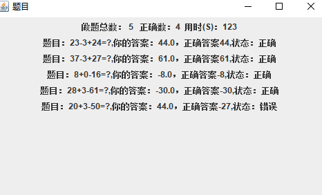 p5.add(new JLabel("做题总数: " + xd + " " + " 正确数:" + rightkey + " 用时(S):" + (time2 - t1) / 1000));