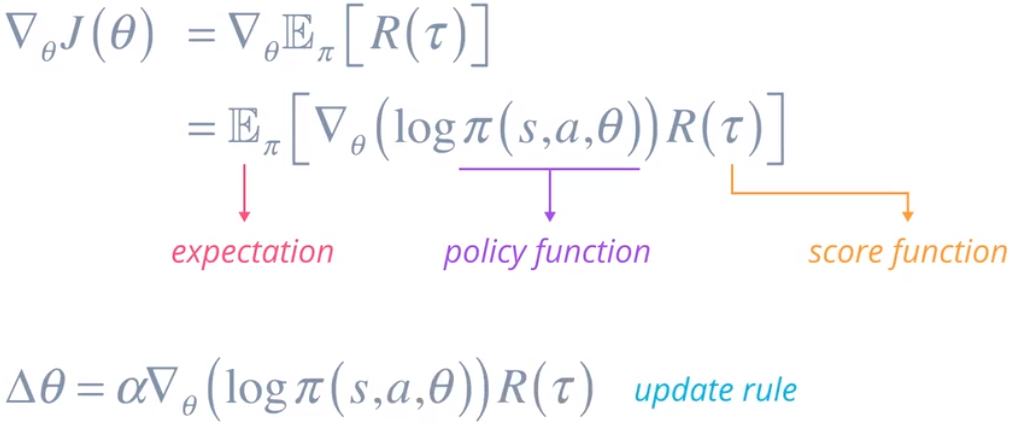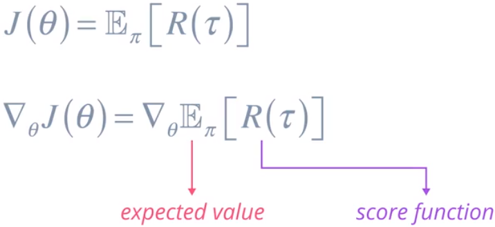 回到强化部分。这是梯度表达式。用策略函数 π 替换概率分布,以及我们自己的得分函数 R,它可以是所有奖励或折扣奖励的和,或者其他基于值的函数。你可能会疑问,我们从这整个练习中获得了任何结果吗?看起来和之前的一样糟糕。我们来仔细看看它。我们可以通过与环境互动并对获得的奖励求和计算得分函数,如果我们有一个使用神经网络等估算器实现的策略函数,那么我们可以计算输出概率的对数以及导数。TensorFlow 或 PyTorch 等库可以帮助我们完成这一步。最后,我们可以通过抽取一批不同的样本以随机方式计算这个预期函数,我们可以使用这个梯度更新策略参数从而以迭代方式改善目标函数,因此我们可以根据它构建一个具体的算法。