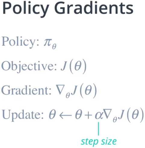 我们可以将基于策略的方法扩展到涵盖大型连续性状态空间,方法是使用一个函数来估算策略,就像值函数逼近一样。为此,我们用 θ 参数化策略,θ 可以是神经网络或其他模型的权重。