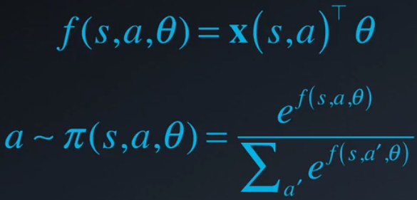 一个简单的近似函数是这些特征的线性组合。但是因为我们希望最终输出是一个可以从中抽样的概率分布,因此需要进行一些转换。例如我们可以应用 Softmax 函数。该函数通过除以所有动作的指数之和,指数化线性组合的结果并使其标准化,这样可以形成一组和为 1 的动作概率值。注意,这种转换仅适用于一组离散的动作。