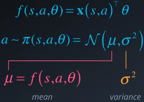 该分布的参数由我们的特征决定,例如,均值 μ 可以是特征的简单线性组合,σ2 可以是固定的值或以类似的方式参数化。我们可以对任何近似函数应用相同的技巧。这些函数会生成一些值并将这些值变成表示随机性策略的概率