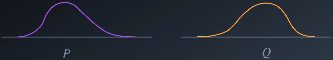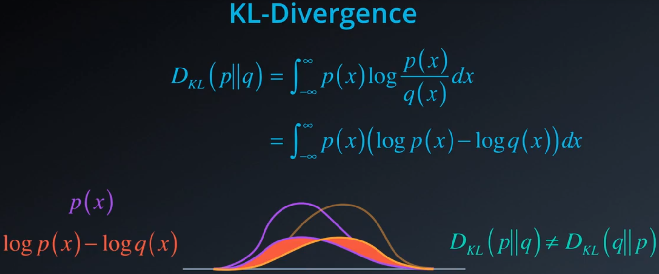 一种统计学衡量方法是 KL 散度。p 相对于 q 的 KL 散度定义为 p(x) 的积分乘以 p(x)/q(x) 的对数,我们可以将 log p(x)/q(x) 变换成 log p(x) - log q(x),这样可能更容易理解。这是原始分布p(x) 和 q(x),我们取这两个概率的对数,然后在每个点 x,我们将这两个对数概率相减,最后,我们用某个概率值缩放该差值,并在整个 x 的范围内求和。从图中可以看出,该区域是这两个对数概率分布的非重叠区域,但是使用其中一个概率作为参考,在每个位置 x 求和意味着 p 相对于 q 的 KL 散度,不等于 q 相对于 p 的散度。这是一个非对称距离衡量法。