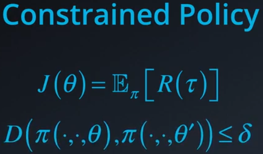 我们来举一个有四条腿的行走机器人例子。一个策略可能使机器人这样行走。另一个策略可能使机器人的步法完全不一样。两个策略都是合理的解决方案。假设策略 A 是当前策略,策略 B 是梯度目标指向的策略,一个更好的策略。我们的优化算法将尝试更新参数以从 A 移到 B。但是并非一直这样。因为我们使用了学习步骤 α,因此我们进入一组中间策略参数,但是可能会导致很糟糕的性能。这在行走等复杂的控制任务中很常见。不同动作之间的坐标和时间非常重要,算法依然在学习改善策略并获得合理的结果,但是学习流程本身可能会非常不稳定并且效率很低。此外,在某些应用中,例如机器人,我们会处理电子机械组件,显著改变策略参数可能会破坏装置。因为这些原因,除了目标函数之外,我们还应该注意策略参数。实际上,我们可能需要对策略参数进行一些限制,只能以某种方式更改参数,或只能按照一定的数量更改参数。我们可以通过添加限制条件,在基于梯度的算法中实现这一点,要求两个策略之间的差异不能超过某个阈值 δ。
