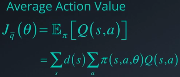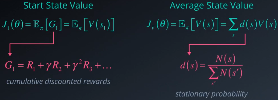 如果你有一个阶段性任务,那么一种方式是使用第一个时间步 G1 的回报均值,即整个阶段的累积折扣回报,等同于起始状态的值。在连续环境中我们不能依赖于特定的起始状态,因此最好将目标与不依赖于这种状态的衡量方法相关联。一种此类衡量方法是平均或预期状态值。凭直觉来看,你希望选择一个使平均值更高的策略,但是某些状态的发生频率可能高于其他状态,因此现在每个状态值需要用相应状态的发生概率进行加权,即平稳概率,计算方法是将状态的发生次数除以所有状态的总发生次数。相关衡量方法是以类似方式计算的平均动作值或 Q 值。