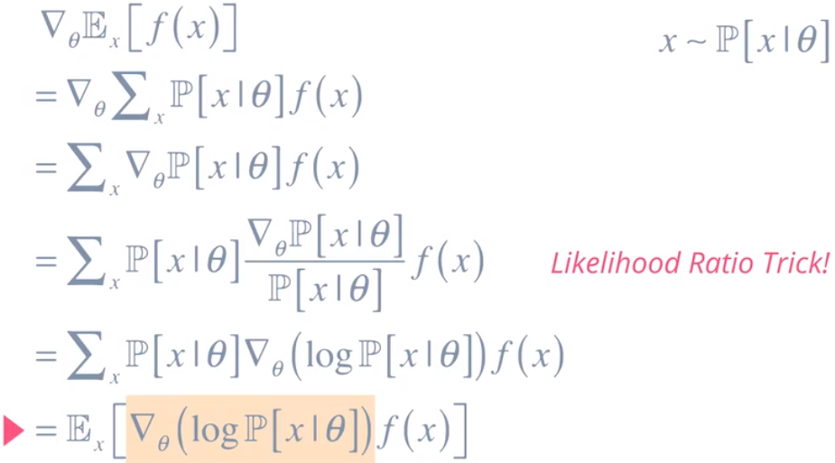 为了进行简化,我们将考虑某个依赖于 x 的随机得分函数 f,值 x 来自由参数 θ 定义的概率分布,这意味着我们可以将预期函数展开为一个积分或 x|θ 的概率乘以得分函数的和。注意,这里的梯度可以移到求和运算中,这样可以进一步简化公式。现在我们可以使用似然比技巧。首先,我们将分子和分母乘以 P[X|θ],然后将生成的分数替换为对数概率的导数。这是一个很有名的技巧。最后,我们将求和变回预期函数。注意,我们只需计算对数概率的导数,而不是得分函数,因为它并不直接依赖于 θ