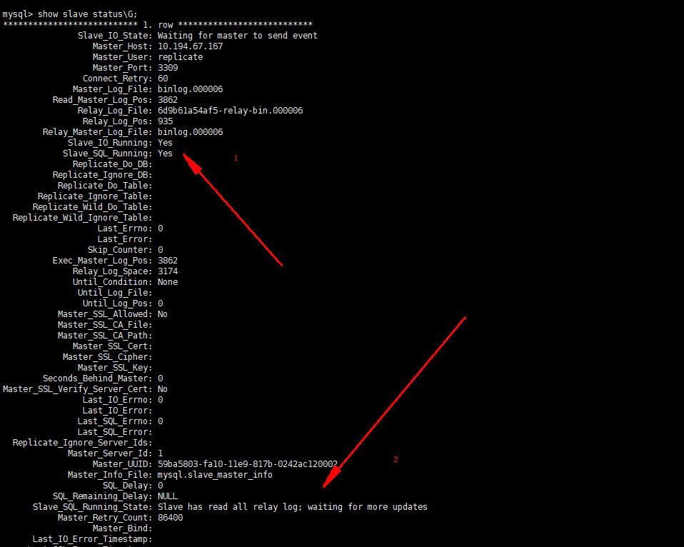 show slave status\G # 查询slave的状态,Slave_IO_Running及Slave_SQL_Running进程必须正常运行,即YES状态,否则都是错误的状态 错误可以在2标记处查看到原因,也可以通过 show slave status;