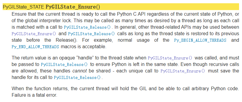 由于 Python 提供了一套供 C 语言调用的接口,允许在 C 程序中执行 Python 脚本,于是翻看这套 API 的文档,看看能否找到答案。