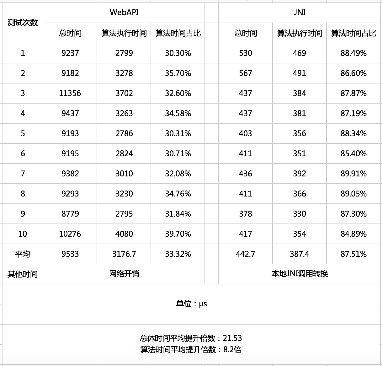 而通过 JNI 接口本地调用,算法的执行时间占到了整个接口执行时间的 80%以上,而 Java JNI 的接口转换过程只占用 10%+的时间,有效提升了效率,减少额外时间的浪费。