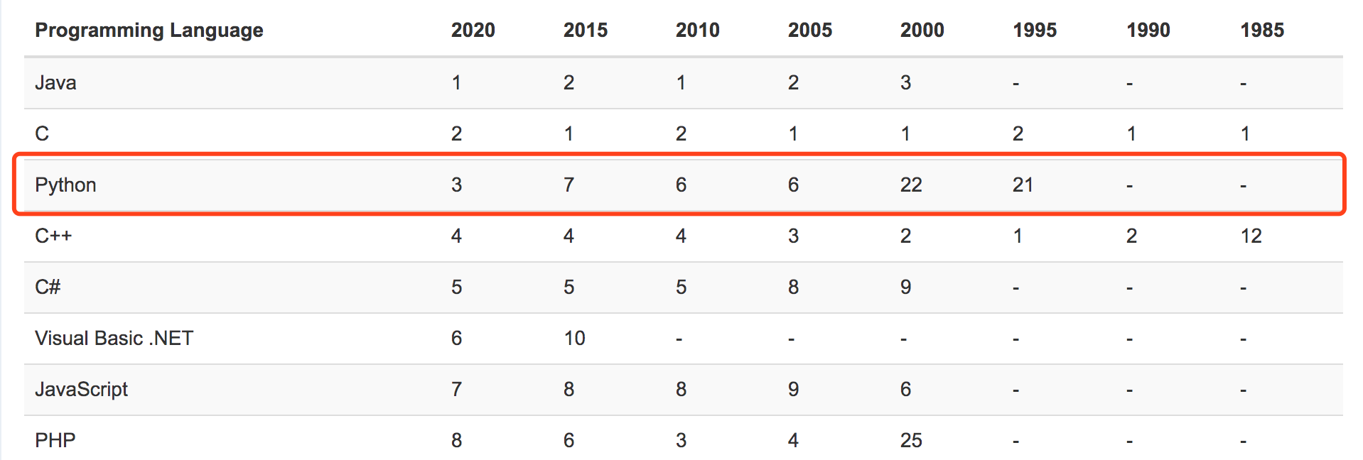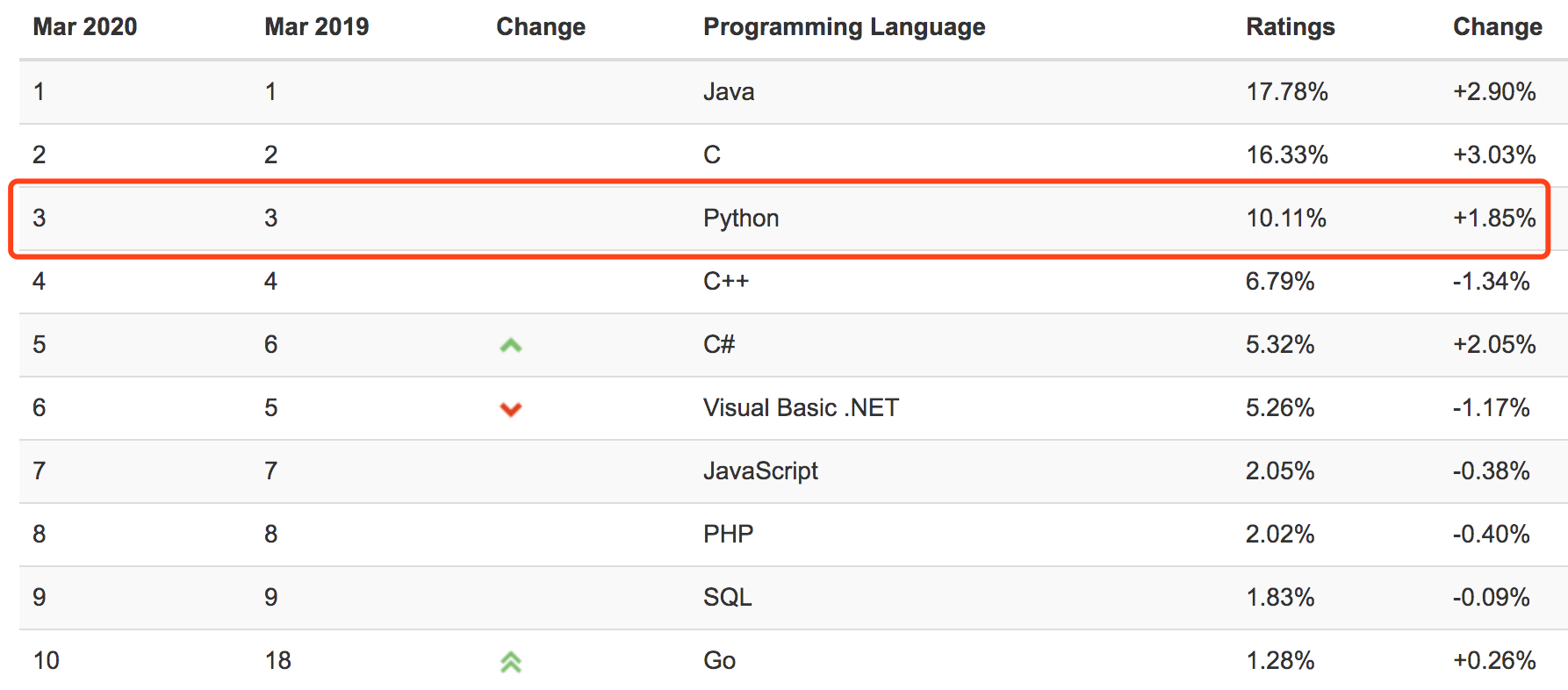 以 tensorflow、pytorch 等为主的机器学习/深度学习的开发框架大行其道,助推了 python 这门曾经以爬虫见长(python 粉别生气)的编程语言在 TIOBE 编程语言排行榜上一路披荆斩棘,坐上前三甲的宝座,仅次于 Java 和 C,将 C++、JavaScript、PHP、C#等一众劲敌斩落马下。