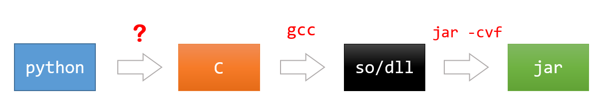 先将 Python 源代码转换成 C 代码,之后用 GCC 编译 C 代码为二进制模块 so/dll,接着进行一次 Java Native 接口封装,使用 Jar 打包命令转换成 Jar 包,然后 Java 便可以直接调用。