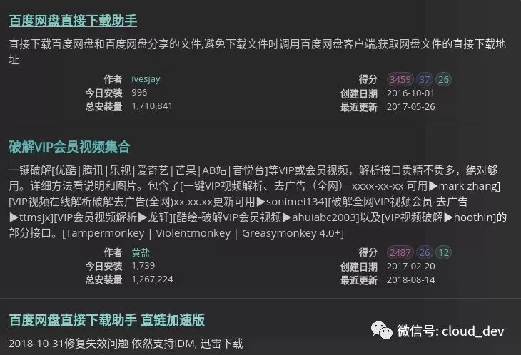 这个中文俗称油猴,它其实是一个脚本仓库,提供了各式各样的脚本,通过这些脚本,可以完成很多强大的功能,比如去广告,下载百度云盘大文件,自动比价...总之,你在上面逛一圈,会感觉像发现了新大陆。